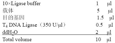 1. 连接反应:利用经过限制性内切酶消化的线形载体与目的基因两端暴露出的平末端或相同的粘性末端,使用T4 DNA 聚合酶将二者连接起来形成重组载体。